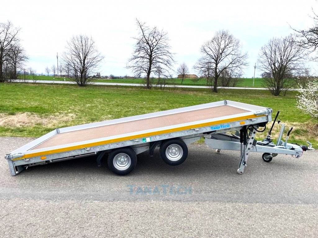 Hydraulicky sklopný přívěs Eudard s ložnou plochou 4m a nájezdovým úhlem pouze 7 stupňů. Umožňuje najetí sportovních automobilů či speciálních strojů s nízkou světlou výškou. Perfektní pro sportovní auta či stroje s nízkou světlostí. Možno nacenit i jiné větší tonáže a větší rozměry!