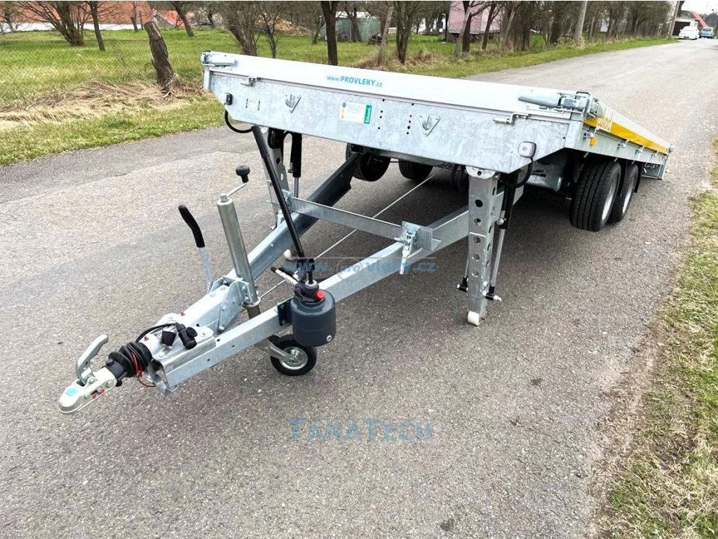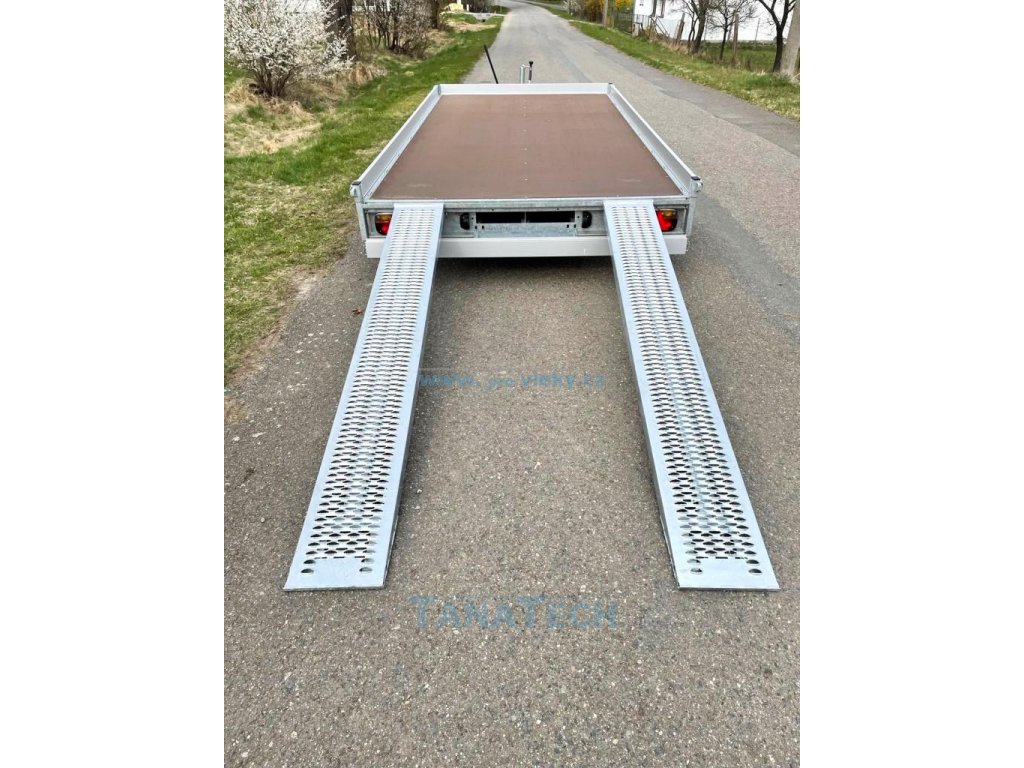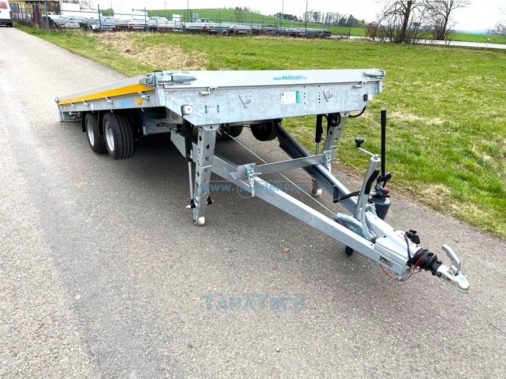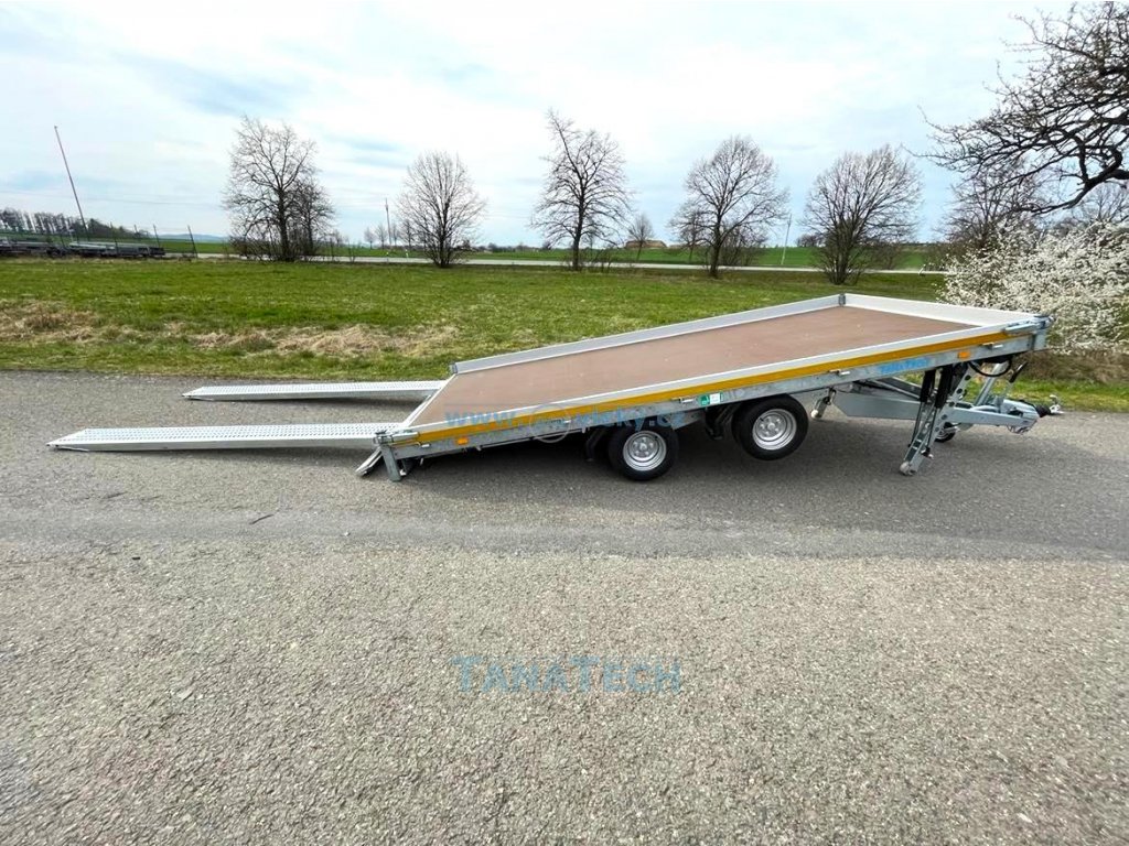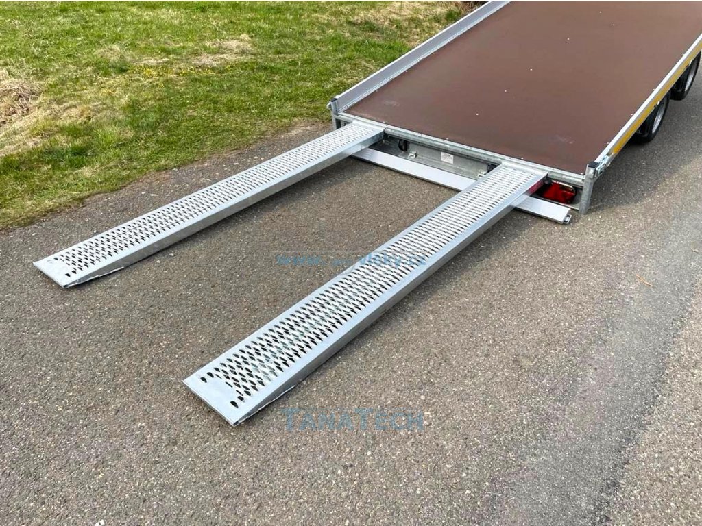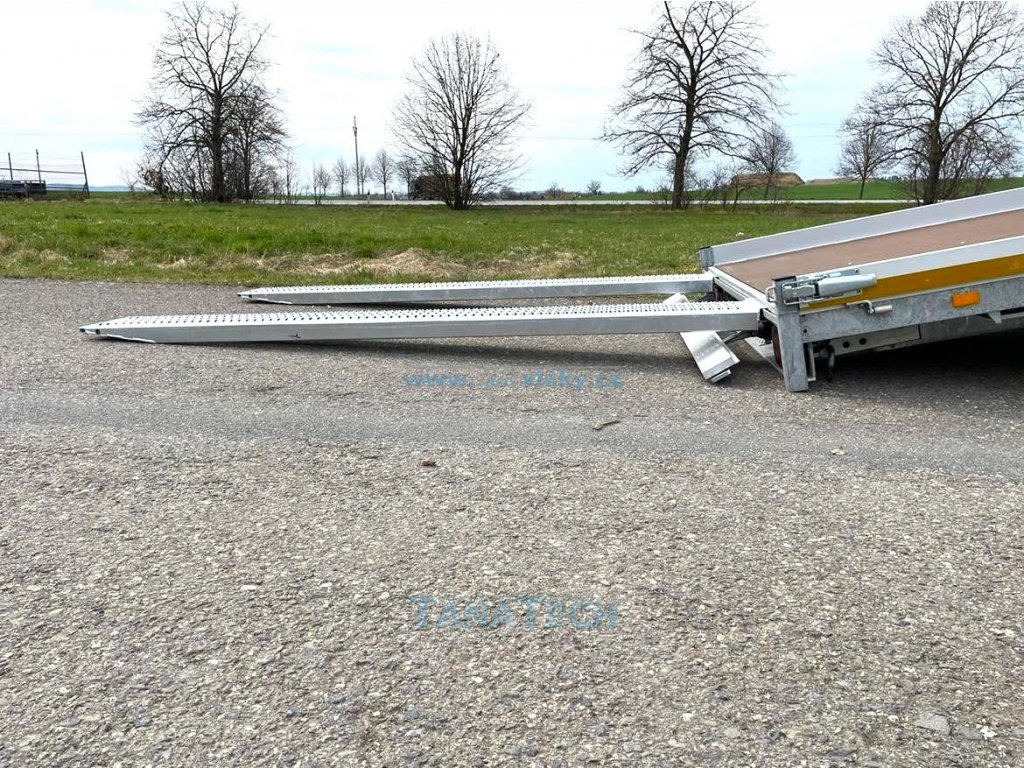 Hydraulicky sklopný přívěs Eudard s ložnou plochou 4m a nájezdovým úhlem pouze 7 stupňů. Umožňuje najetí sportovních automobilů či speciálních strojů s nízkou světlou výškou. Perfektní pro sportovní auta či stroje s nízkou světlostí. Možno nacenit i jiné větší tonáže a větší rozměry!