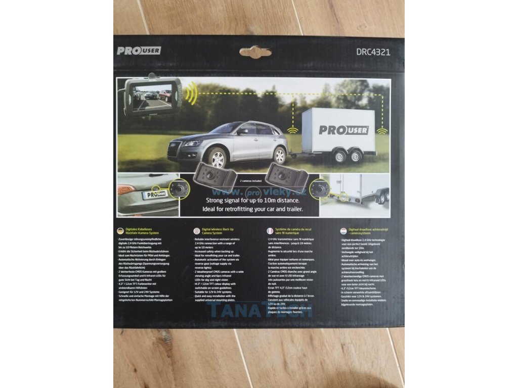 Kamera se automaticky aktivuje při couvání, má vestavěný 4,3 LCD displej s indikací vzdálenosti a má 6 IR LED pro lepší noční vidění a digitální bezdrátový vysílač 2,4 Ghz.
