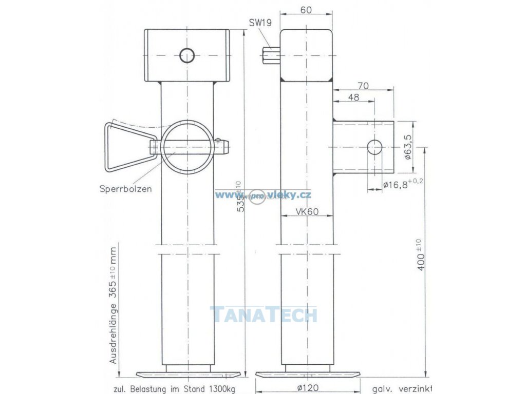 Nastavitelná otočná opěrná noha pro přívěsy a pracovní stroje s průměrem jeklu 60 mm. Zinkovaná opěrná noha s celkovou výšku při vysunutí až 415 mm. Výška zdvihu 240 mm. Opěrná noha je montována pomocí adaptéru na rám vozidla zajištěna kolíkem.