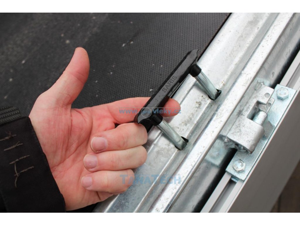 - Síťové háky na závěsech klapek pro napínání sítí a plachet pro zajištění nákladu