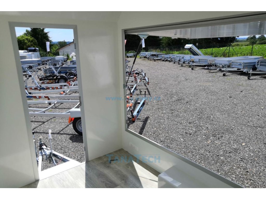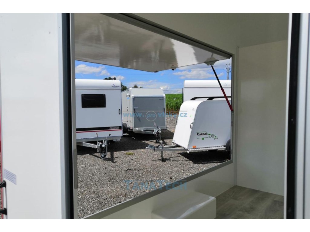 Přívěs vybavený jako prodejní stánek - vstupní dveře, boční výklop, opěrné nohy.