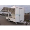 Přívěs vybavený jako prodejní stánek - vstupní dveře, boční výklop na boku a v zadní části , opěrné nohy.