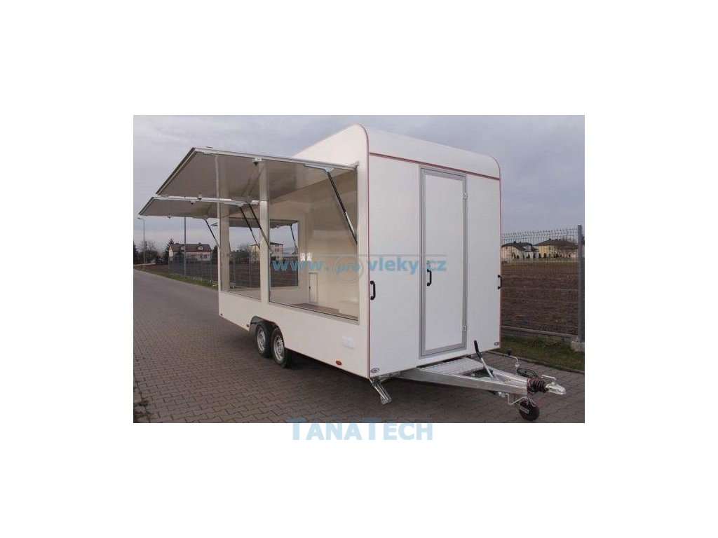 Přívěs vybavený jako prodejní stánek - vstupní dveře, boční výklop na boku a v zadní části , opěrné nohy.
