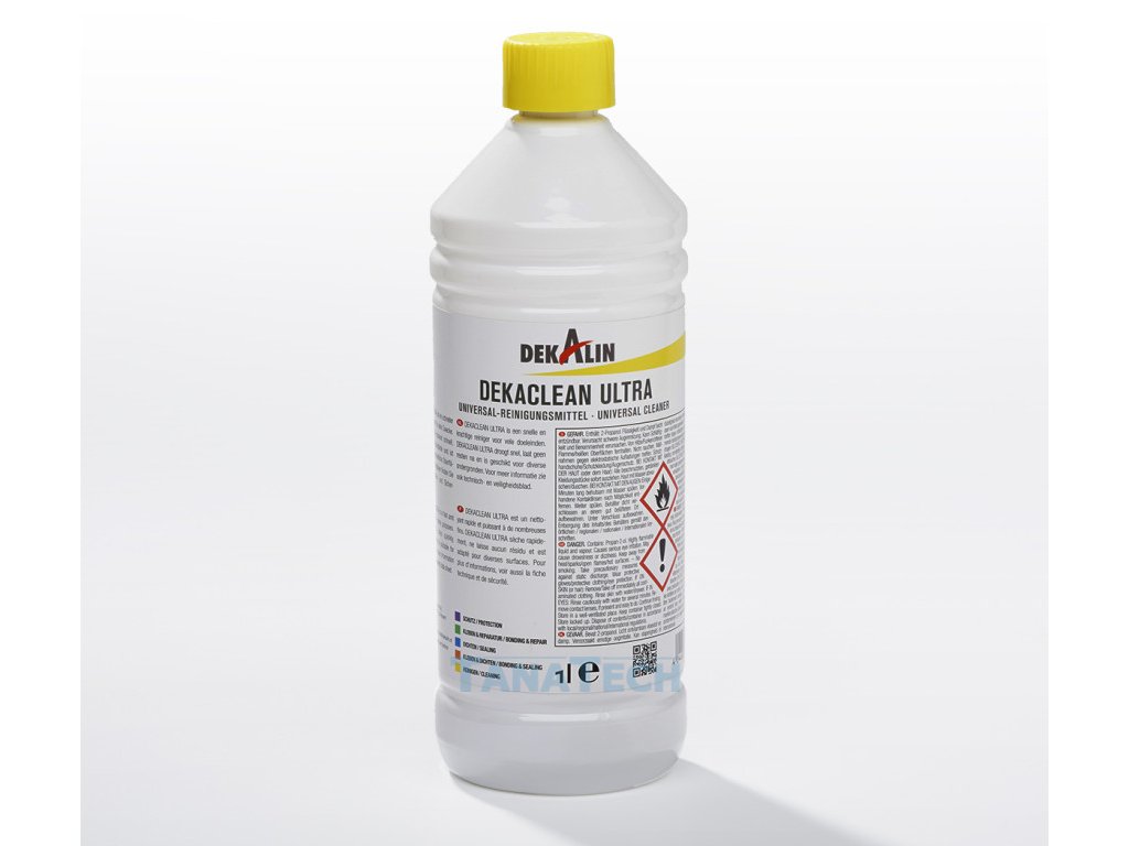 Dekaclean Ultra je rychlý a účinný čisticí prostředek s univerzálním použitím. Dekaclean Ultra rychle schne, nezanechává zbytky a je vhodný pro různé povrchy. Dekaclean Ultra je ideální pro čištění a odmašťování podkladů pro lepení a těsnění specifickými produkty Dekalin.