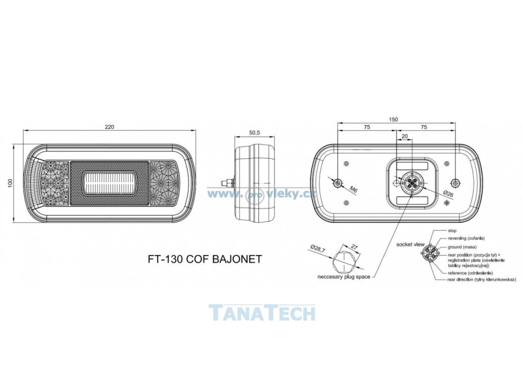 Zadné svetlo FT-130 od firmy Fristom je určené pre prívesy, autoprepravník, Autotransporter a tam, kde je zadný panel svetiel málo vysoký. Minimálna výška zadného koryta je pre montáž 100,5mm viď. rozmer svetla. Vďaka LED technológii s neónovým efektom obrysových svetiel je svietidlo dobre vidieť v zlom počasí bez oslňovalo ostatných vodičov.