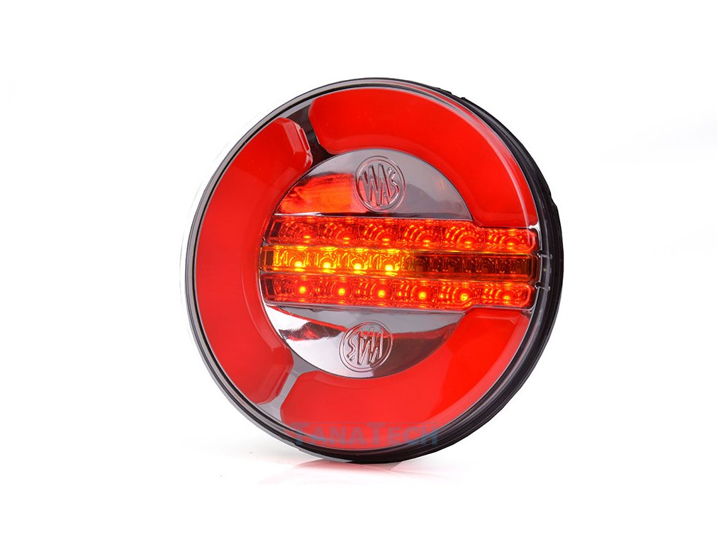 Krásna guľatá zadné LED svietidlo na prívesy, návesy a iné vozidlá. Pozičný časť je umiestnená po obvode s tzv. Neónovým efektom, ktorý je príjemný a neagresívny pre oči. Smerová časť je tvorená stredovým pruhom s efektom. Brzdová časť je tvorená dvoma pruhmi medzi SMEROVKY. Tvar umožňuje pravoľavou montáž.