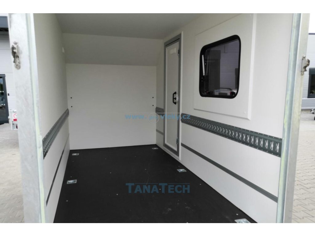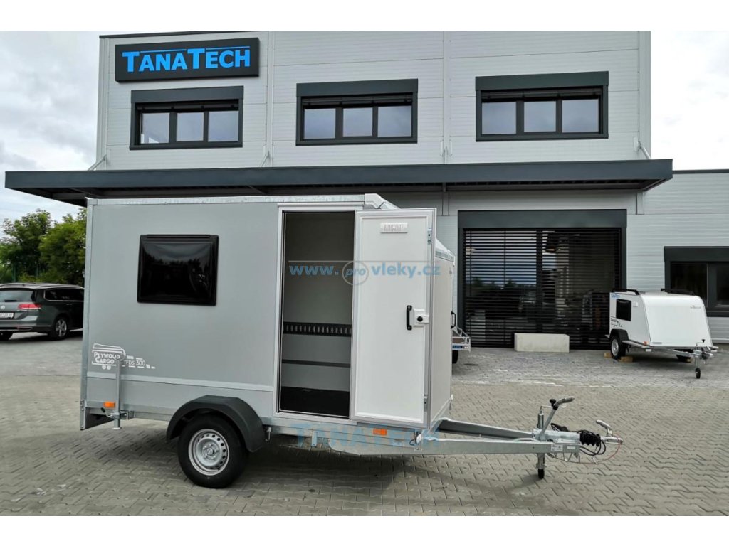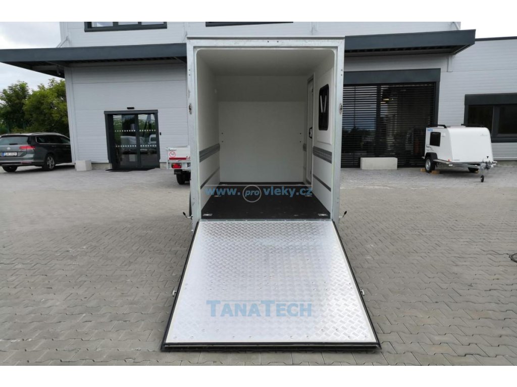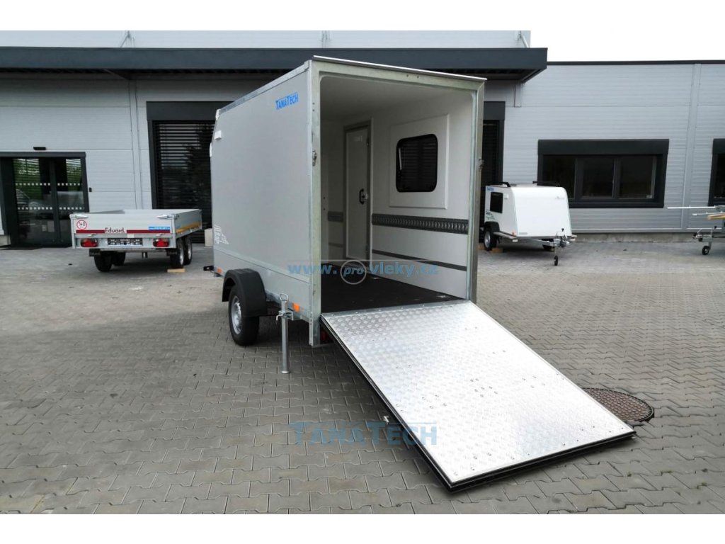 Skvěle vybavený překližkový brzděný přívěsný vozík s předním aerodynamickým skosením, zadní nájezdovou rampou, bočními dveřmi a oknem.