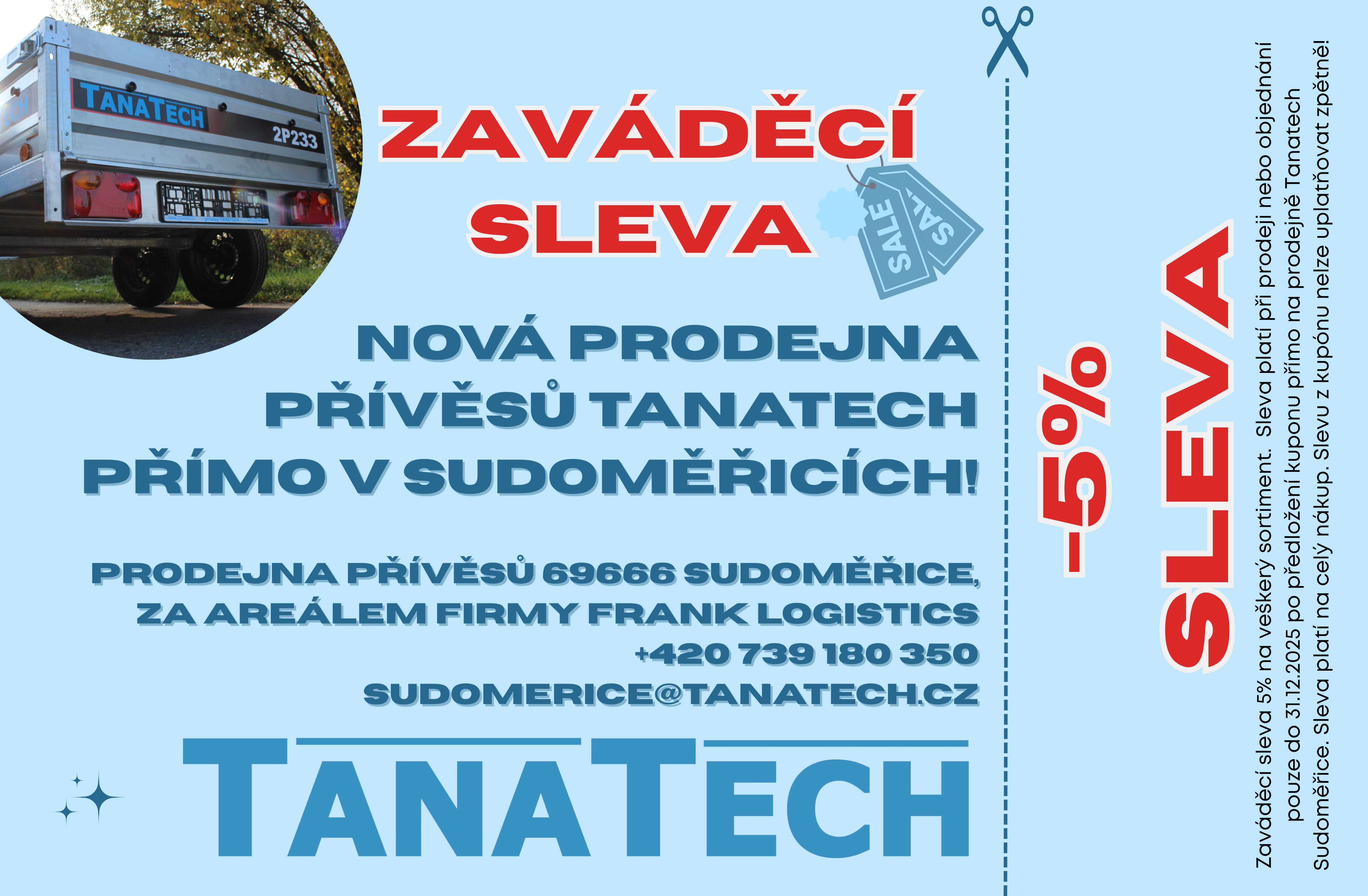 V prodejně v Sudoměřicích na hranicích Česka a Slovenska na Vás čekají přívěsy na ploše 4000m2. Naskladňujeme přívěsy od 4.8.2025. Skvělá dostupnost z Hodonína, Uherského Hradiště, Brna, Kyjova, Veselí nad Moravou, Skalice, Holíče, Senice. Firma Tanatech s.r.o. je importér přívěsů do ČR a SR.