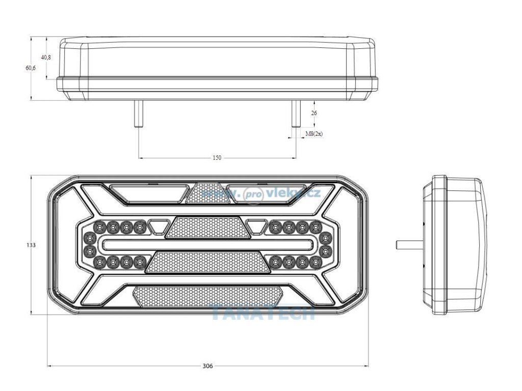 - Rozměr zástavby303x133x67xmm - lza nahradit většinu sdružených svítilen u přívěsů